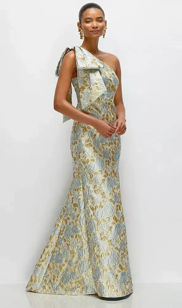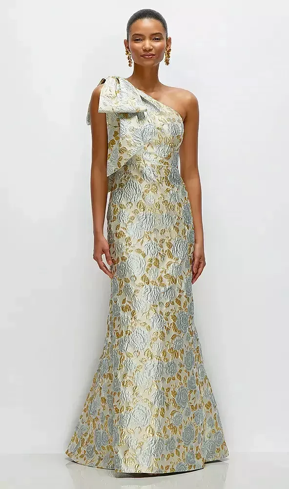 This luxe gold leaf brocade one-shoulder dress epitomizes timeless glam. The opulent woven floral pattern with a soft white or pale blue backdrop makes the shimmering gold accents pop, catching the light with every move. The oversized bow at the shoulder adds a chic vibe to this lush design, while the soft trumpet skirt flows effortlessly into a slight sweep train with a 1-inch horsehair hem for a polished edge. This rich gold leaf floral maxi dress is next-level luxury, making you feel like pure royalty at any event.