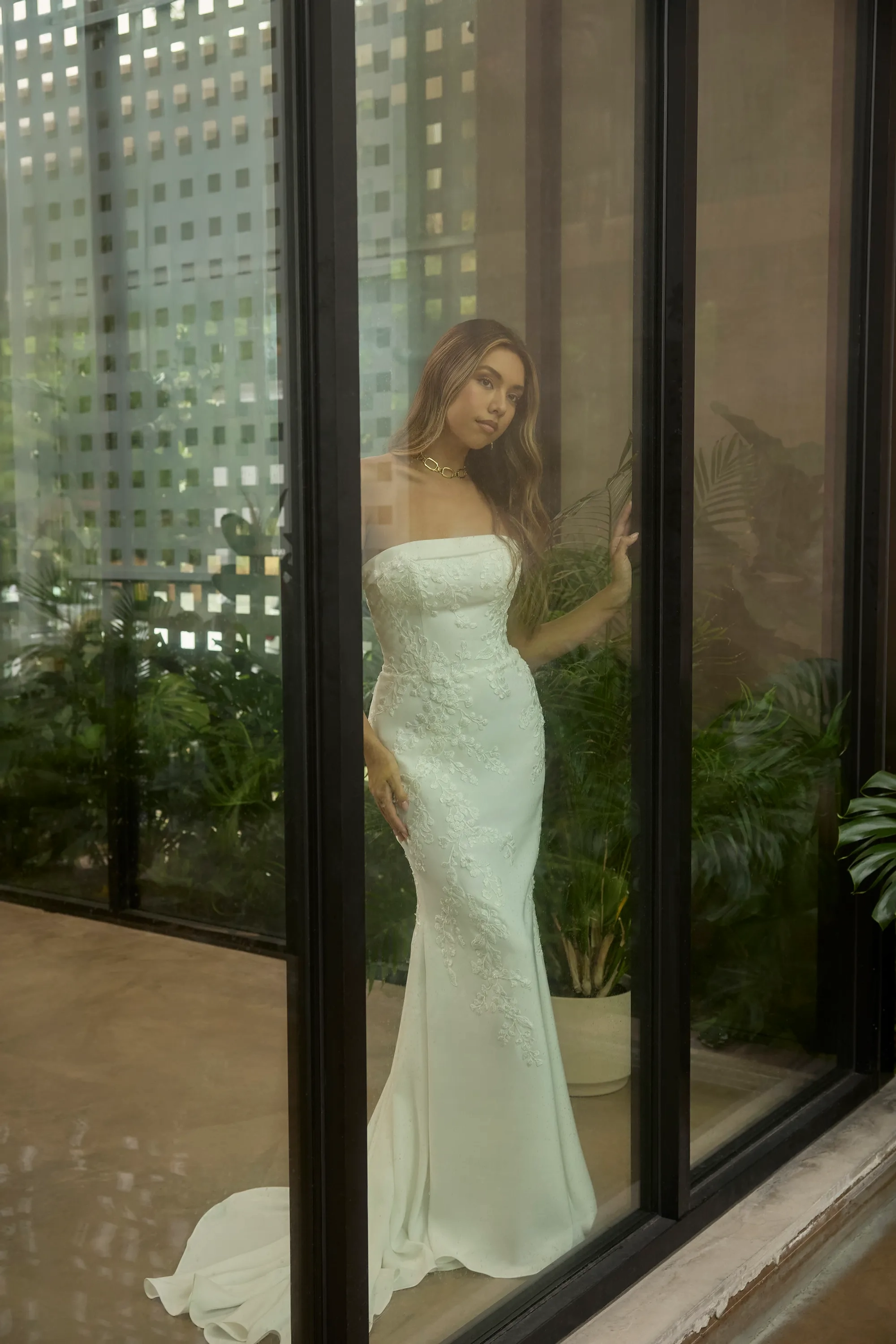 Sleek, sculptural, and effortlessly elegant, BL495 Acacia is a modern classic with a soft romantic twist. This strapless fit-and-flare gown features a clean straight neckline framed by a folded lapel detail, adding architectural dimension to its timeless silhouette. Crafted from soft matte satin with delicate floral lace appliqués that cascade down the bodice and skirt, Acacia blends minimalist structure with subtle texture. A stretch knit lining ensures comfort, while the silhouette flows gracefully into a clean chapel-length train for understated drama. Pair it with a dramatic cathedral-length veil, sold separately, for a sophisticated, high-impact ceremony look.